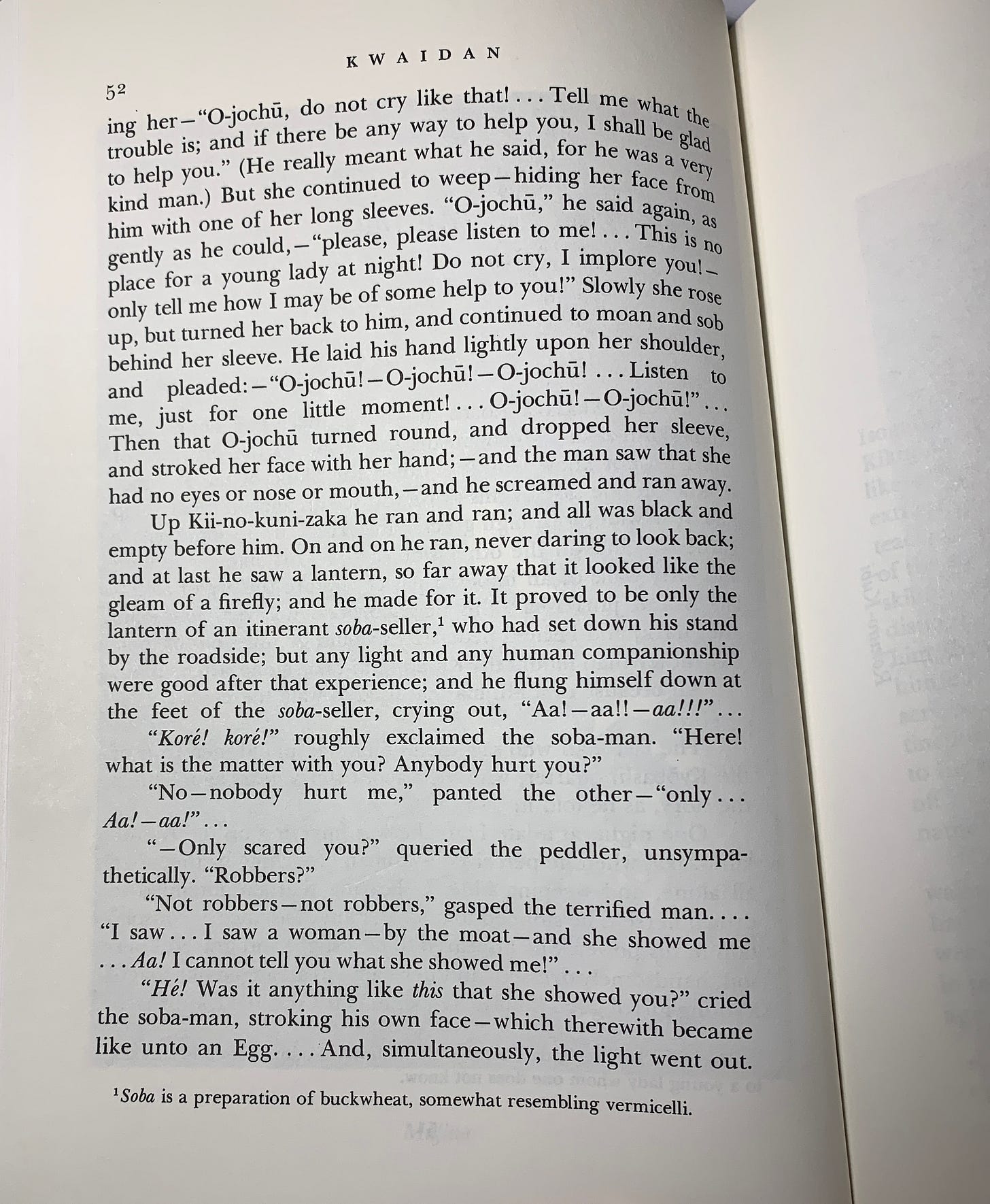 Echoing Dunne’s line above, the collection of folk-tales in Kwaidan are gems of the form. Many of them open with a precision of time and place, settling (or maybe lulling) the reader in preparation for what is to unfold, including magic, horror, the supernatural, in the best storytelling tradition. For example: